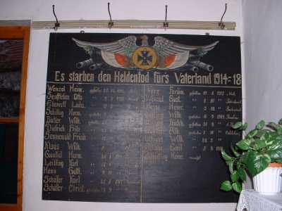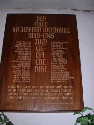 Zum Gedenken an die Opfer des 1. und 2. Weltkrieges steht vor der Kirche das Kriegerdenkmal. Zusätzlich hängen in der Kirche Tafeln, welche die Namen der Gefallenen auflisten.